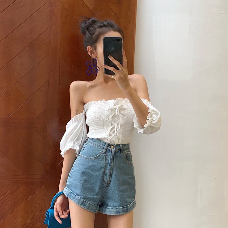 パフスリーブとレースアップが可愛い無地のトップスです!